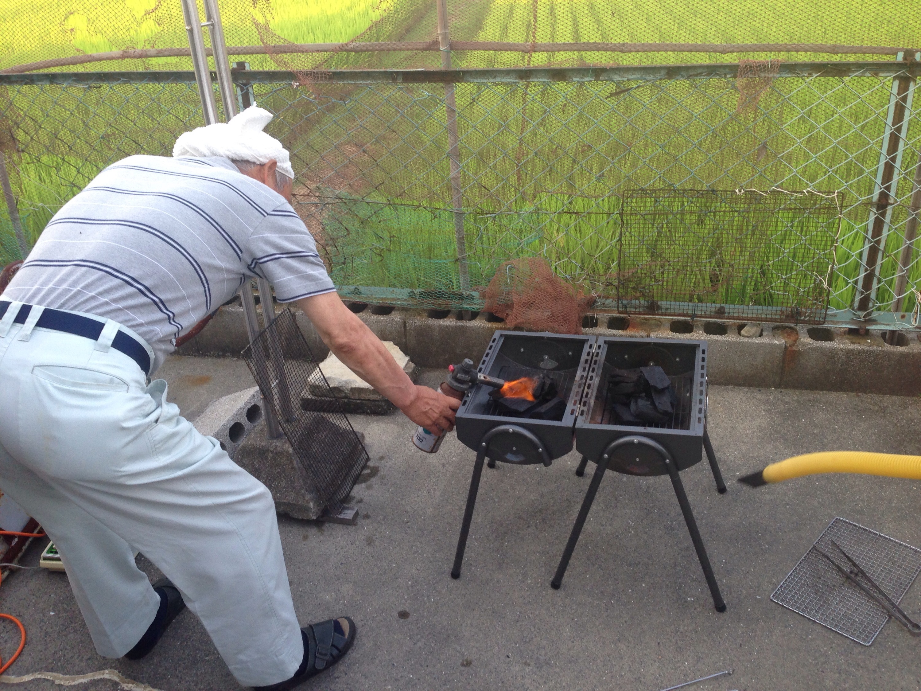 じいちゃん(私の父)がねじりハチマキでせっせと火起ししてます。