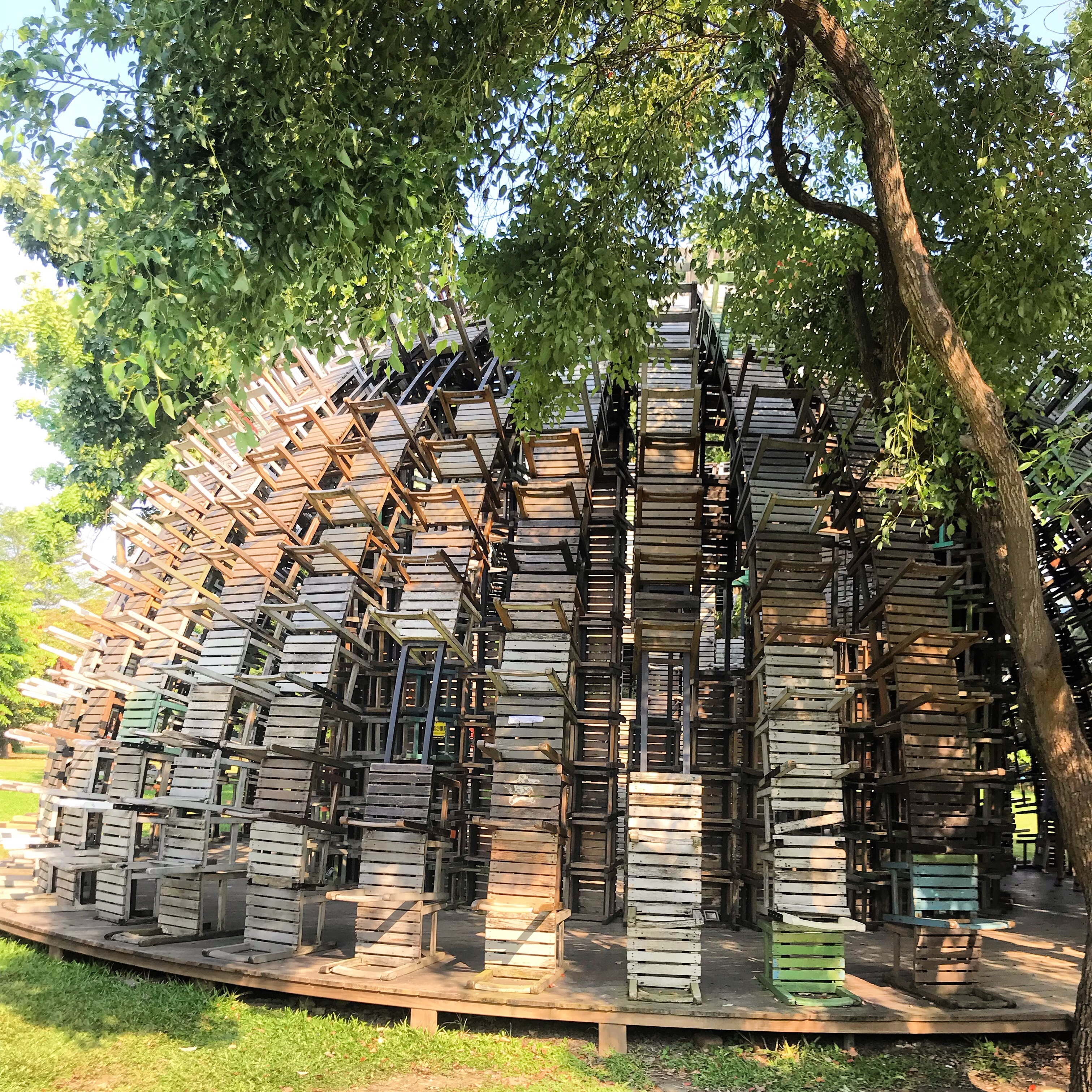 これは大きなドーム状になっていて、実際中にも入れるのですが、全部椅子でできてます。学校にある、椅子。